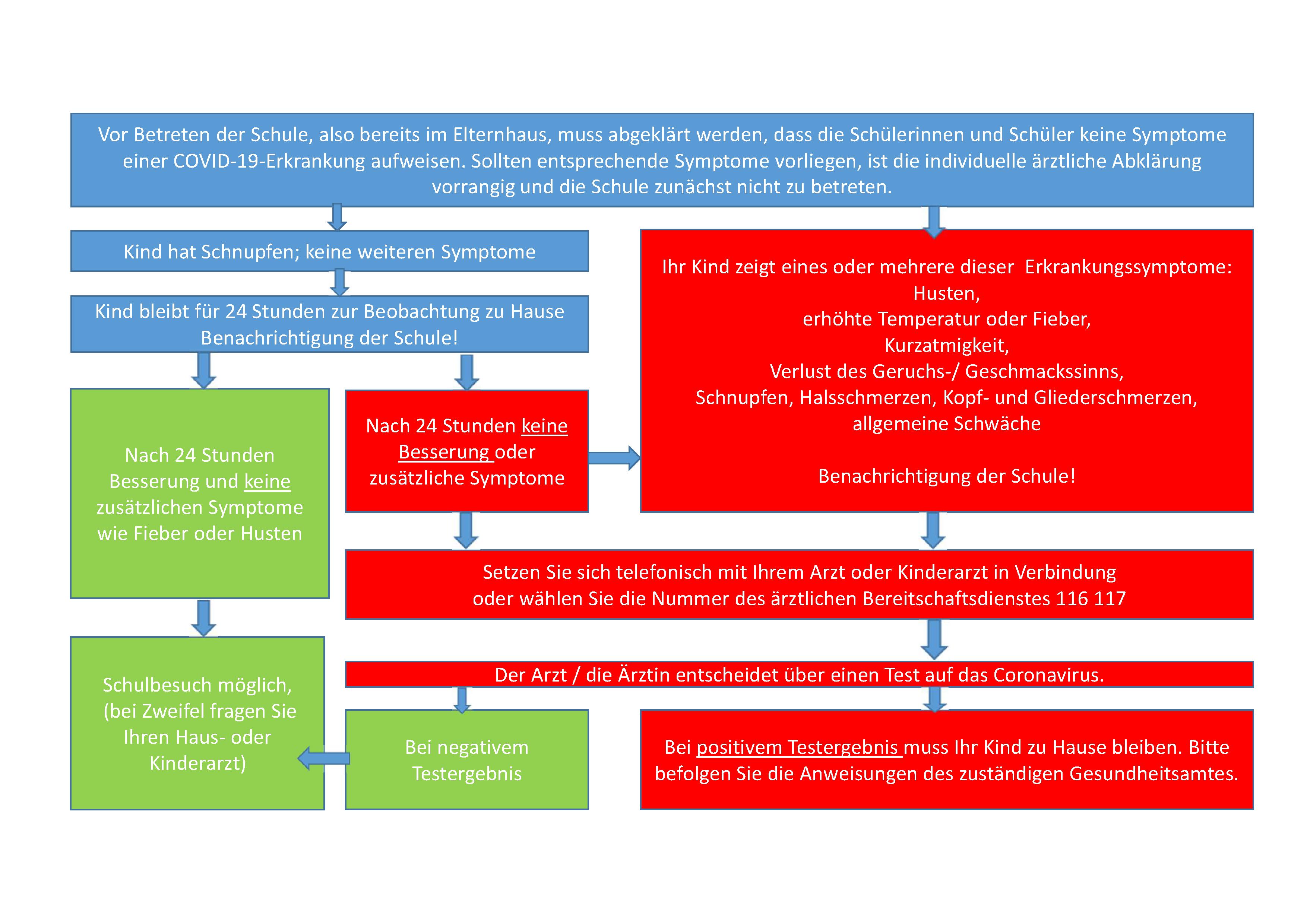 Sollte Ihr Kind/ solltet ihr entsprechende Krankheitssymtome aufweisen, so ist zwingend der in folgendem Schaubild dargestellte Verfahrensablauf einzuhalten: