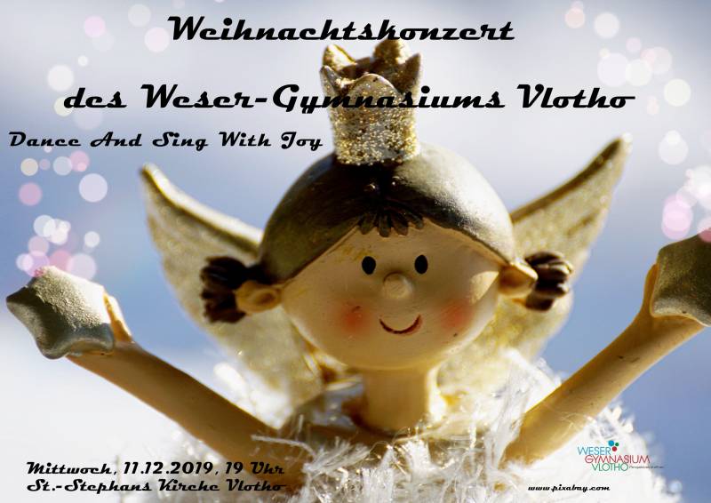das traditionelle Weihnachtskonzertdes Weser-Gymnasiums Vlotho in der St. Stephans-Kirche steht in diesem Jahr unter dem Motto „Dance and sing with joy!“. Am Mittwoch, den 11.12.2019 wollen die Mitwirkenden der Musikarbeitsgemeinschaften die Zuhörer mit einem abwechslungsreichen Programm auf die Weihnachtszeit einstimmen.Der Schwerpunkt liegt auf fröhlichen Weihnachtsliedern und Sätzen, die sowohl klassisch-traditionell als auch unterhaltsam-aktuell sind. Neben den instrumentalen Ensembles, der Band und den Chören werden auch Solo-Gesang und natürlich Orgelspiel zu hören sein.