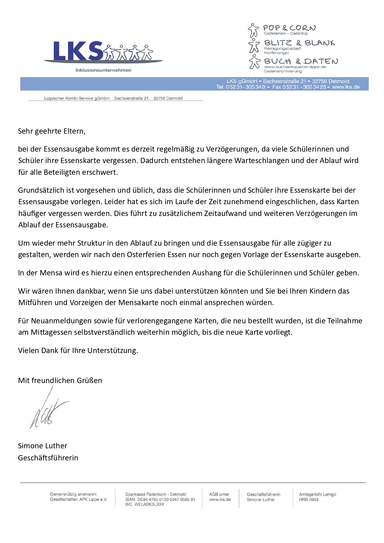 Informationen zur Essensausgabe mit der Bitte um Beachtung - für Eltern