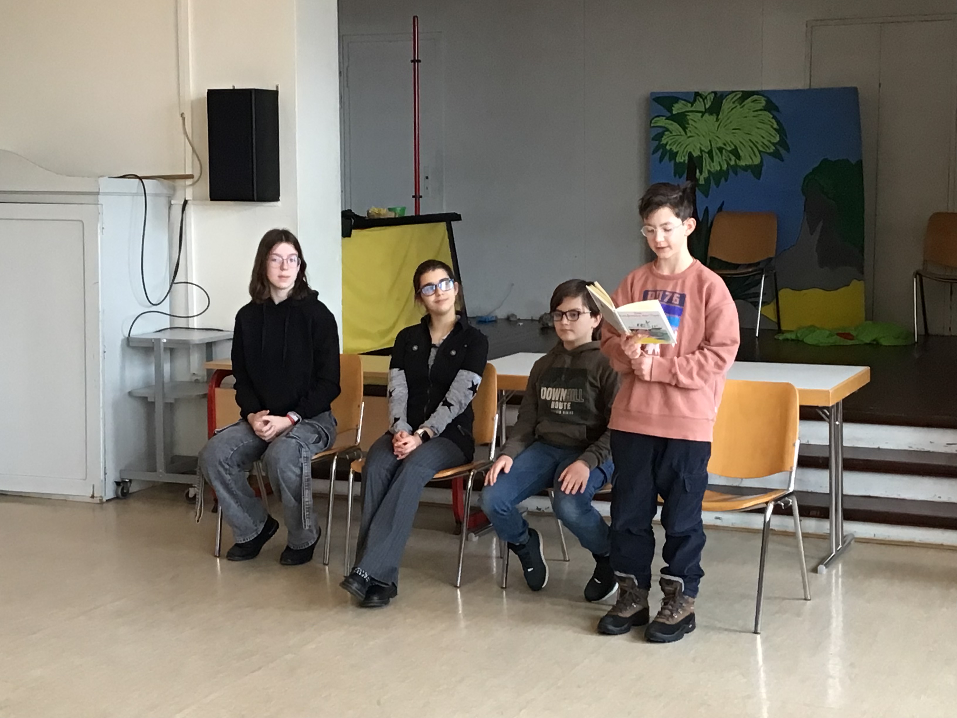Dominik Dorosz (J5), Leander Krieger (J7), Aleksandra Dorosz (J8) und Natalja Unruh (J9) haben vor zwei vierten Klassen vorgelesen aus Erich Kästners „Die Konferenz der Tiere“.