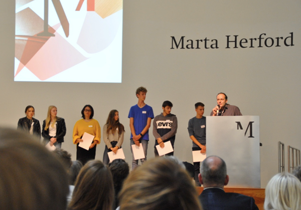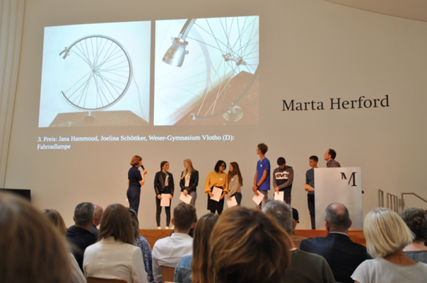 Weiter schreibt Ralf Bittner in der „Neuen Westfälischen“: „Bei der Materialauswahl hatte ein Kunstkurs des Weser-Gymnasiums offensichtlich ein besonders glückliches Händchen. Gleich drei der neun für die Ausstellung im Marta ausgewählten Arbeiten kommen vom Weser-Gymnasium, davon zwei unter den besonders prämierten Projekten.“ Dementsprechend kann sich ebenfalls Dilara Öztürk freuen: Ihr Hocker wird wie die Arbeiten der Preisträger auch Teil der großen Sonderausstellung im MARTA – Museum in Herford, die am 22. 9. 2019 um 10 Uhr eröffnet wurde und bis zum 5. 1. 2020 besucht werden kann. (Weiteres unter: https://www.recyclingboerse.org/projekte/kunst-und-kultur/recyclingdesignpreis-fuer-schueler oder https://www.nw.de/lokal/kreis_herford/herford/22568448_Jung-Designer-aus-Vlotho-vorne-dabei.html)