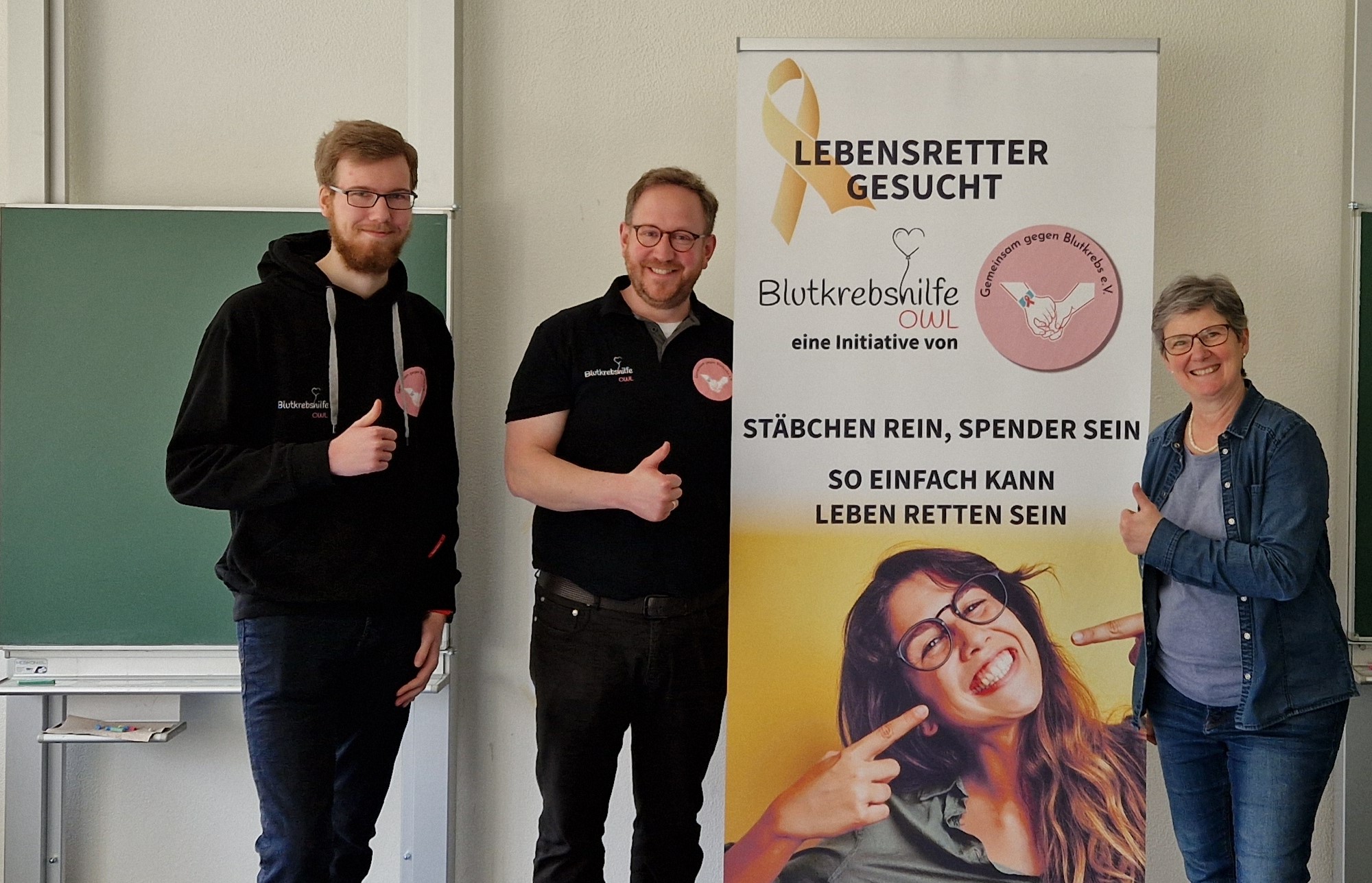 Kurz vor den Osterferien führten Marcel Stöteknuel und Uwe Mönks vom Verein „Gemeinsam gegen Blutkrebs e.V“ gemeinsam mit Hella Happe (WGV) eine Registrierungsaktion für potenzielle Stammzellenspenderinnen und Stammzellenspender durch. 23 Schülerinnen und Schüler der Jahrgangsstufen 10, Q1 und Q2 ließen sich registrieren und können damit vielleicht irgendwann zum Lebensretter bzw. Lebensretterin für jemanden werden. Das ist ein toller Erfolg!