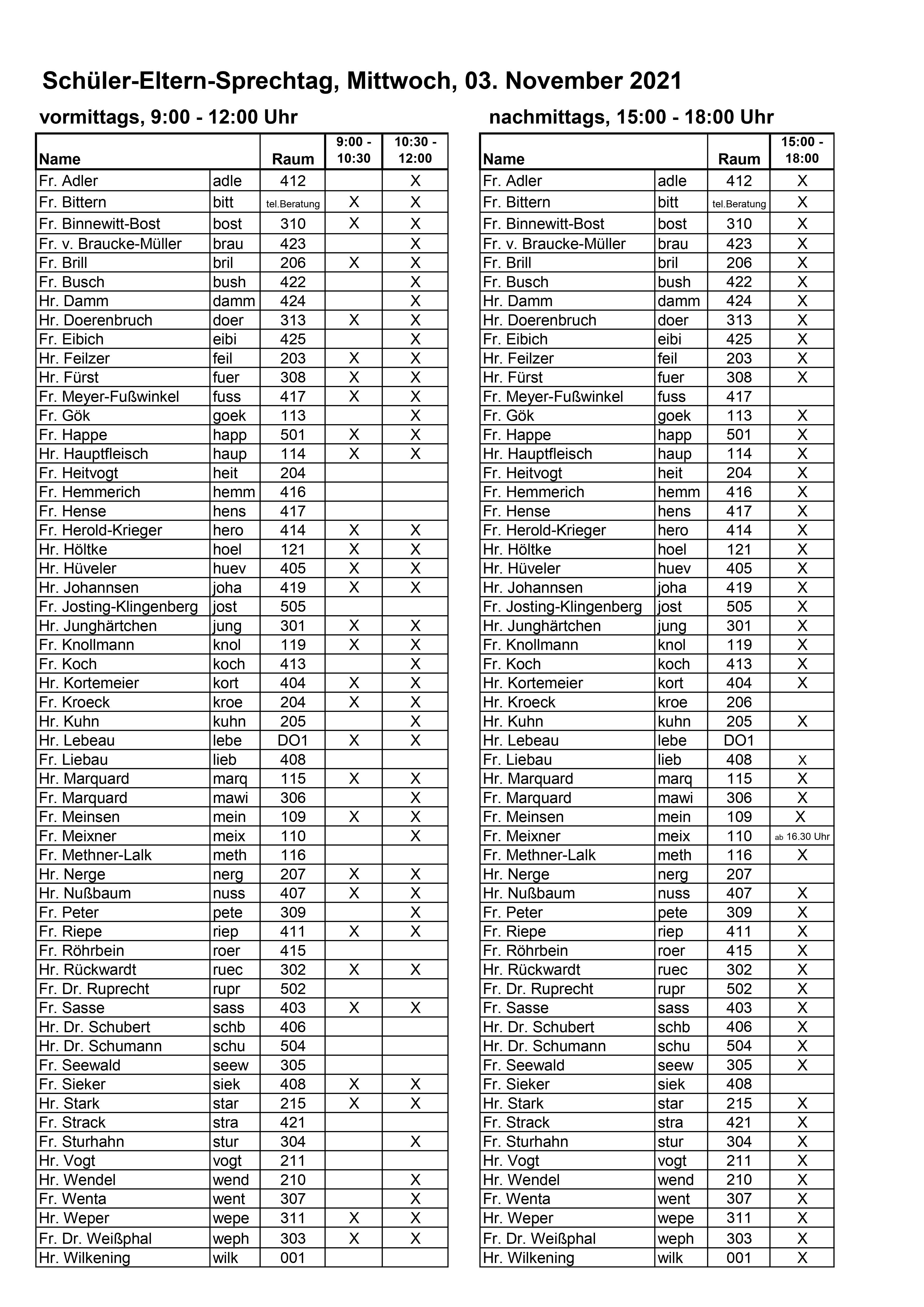 Alle Informationen zum Schüler-Elternsprechtag am Mittwoch, 03.11.2021, sind vor den Herbstferien an alle Schülerinnen und Schüler verteilt worden. Die Einladungen finden Sie hier, den allgemeinen Beratungsbogen hier und die Anwesenheitszeiten der Lehrkräfte hier. Die Anwesenheitszeiten können noch kurzfristig aktualisiert werden. Bitte achten Sie dazu auf die Aushänge im Gebäude.