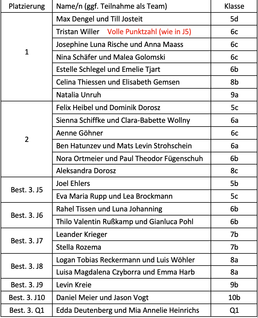 Wir gratulieren allen erfolgreichen Teilnehmenden, insbesondere den folgenden Erst-, Zweit- und besten Drittplatzierten jedes Jahrgangs: