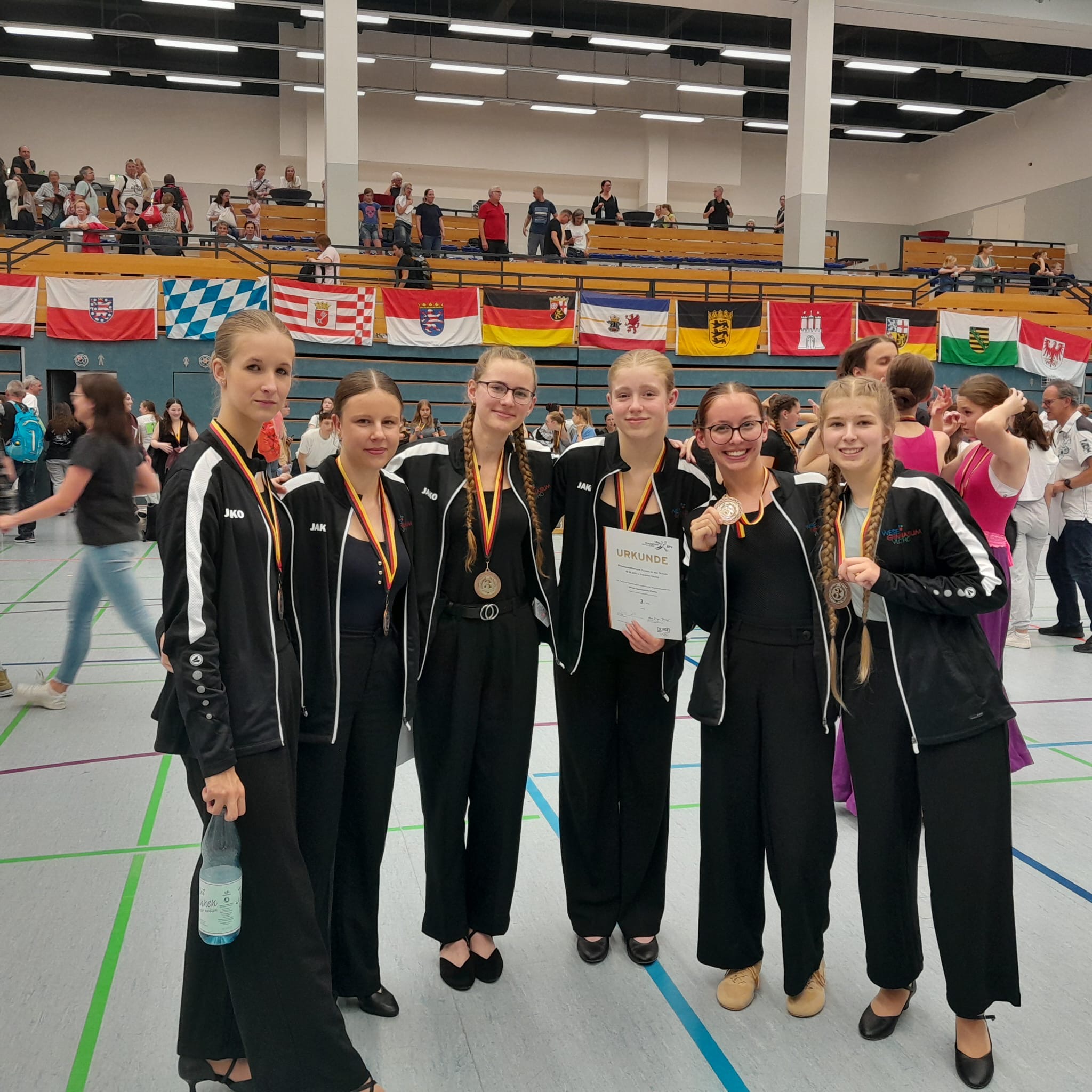 An einem Donnerstag, wie jeder andere, gingen wir (Nele Kregel mit Lara Schiwek, Jette Baumann mit Florentina Holtmeier und Mia Heinrichs mit Jula Westhoff) zum Tanz- Training in die Gymnastik-Halle, wo uns unsere Leiterin - Frau Peter - zu Beginn der siebten Stunde mitteilte, dass im Laufe des Jahres ein Tanzwettbewerb stattfinden wird, an dem wir rein theoretisch teilnehmen könnten. Zunächst waren wir skeptisch, doch nach einiger Zeit der Überlegung, willigten wir in das Angebot ein.