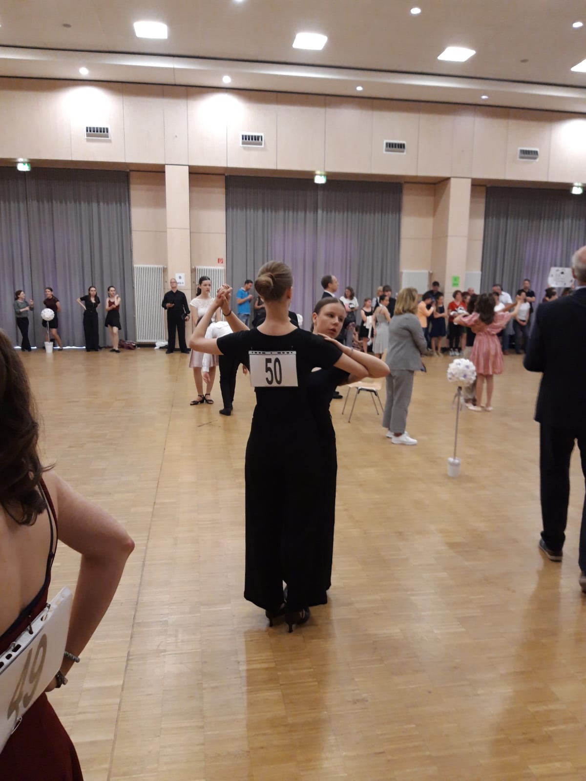 Nach einer kurzen Eintanzphase auf dem ungewohnten Parkett, ging um 13:15 Uhr das Turnier für uns auch schon los. Im langsamen Walzer, Quick-Step, ChaChaCha und Jive gaben wir, die drei Turnierpaare, unser Bestes und wurden von unseren Begleiterinnen am Rand selbstverständlich lautstark angefeuert. Leider reichten unsere Tanzkünste noch nicht aus, um im Finale gegen die anderen Paare bestehen zu können.