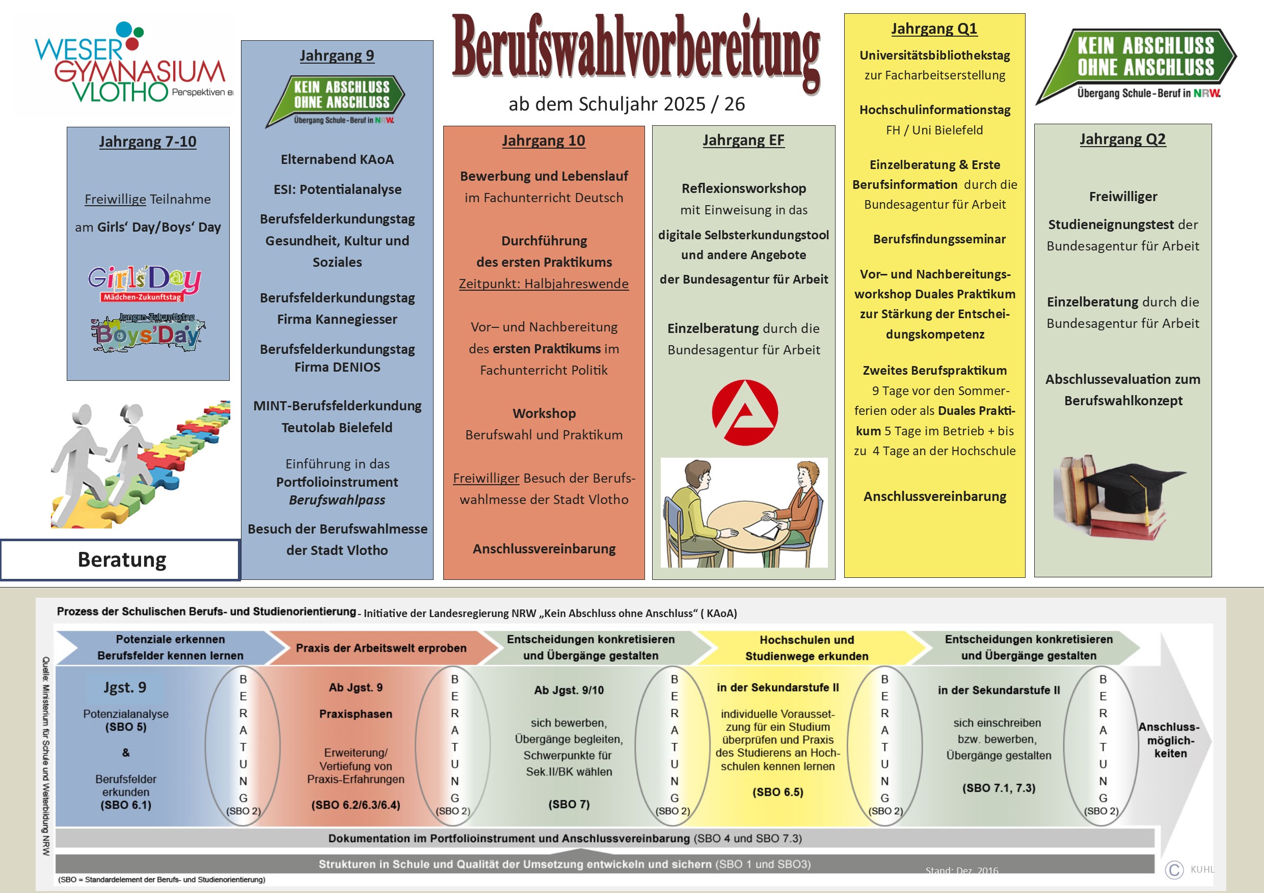 Unseren Schülern gezielte Studien- und Berufswahlorientierung zu bieten ist dem Weser-Gymnasium seit vielen Jahren ein Anliegen und eine Verpflichtung. Neben der fachlichen, methodischen und sozialen Vorbereitung auf die Zeit nach der Schule wollen wir unsere Schüler auch bei der Findung von beruflichen Perspektiven sowie konkreten Nah- und Fernzielen an der Berufs- und Fachhochschule sowie der Universität unterstützen.