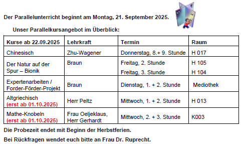 Besonders interessierte und begabte Schülerinnen und Schüler haben die Möglichkeit, parallel zum Fachunterricht Kurse mit außergewöhnlichen Themen zu belegen. Die Unterrichtsinhalte aus dem regulären Unterricht werden dann von den Schülerinnen und Schülern selbstständig aufgearbeitet. Die Anzahl und die Fächer der Parallelkurse können sich von Schuljahr zu Schuljahr ändern. Alle Ergebnisse werden am Ende des Schuljahres in einer öffentlichen Präsentation vorgestellt. Die Lerngruppen, die durch externe Dozentinnen und Dozenten durchgeführt werden, werden von der Osthushenrich-Stiftung finanziell unterstützt. Für dieses Angebot muss von den Eltern ein geringer Jahresbeitrag gezahlt werden. - individuelle Projekte im Rahmen des Förder-Forder-Projekts